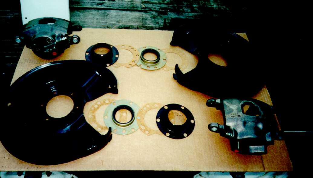 1. Two sets of used pre 1987 1/2 ton GM 4X4 truck (front axle) disk brake backing plates. Get the thick one piece type. Also try and get the used calipers as well, this will help to cover some expense on the core charge of new calipers. These should be available from any good salvage yard with trucks.