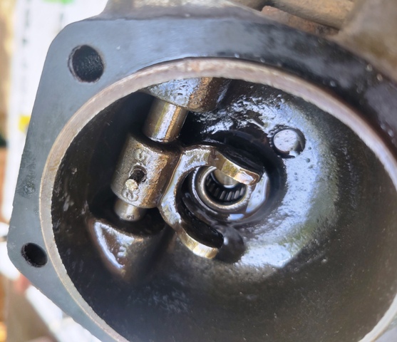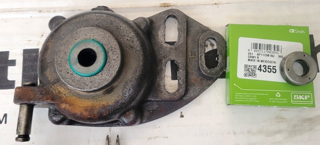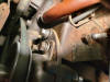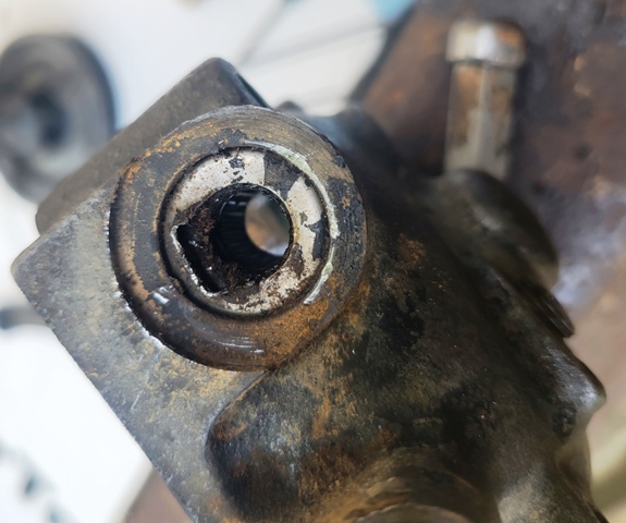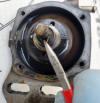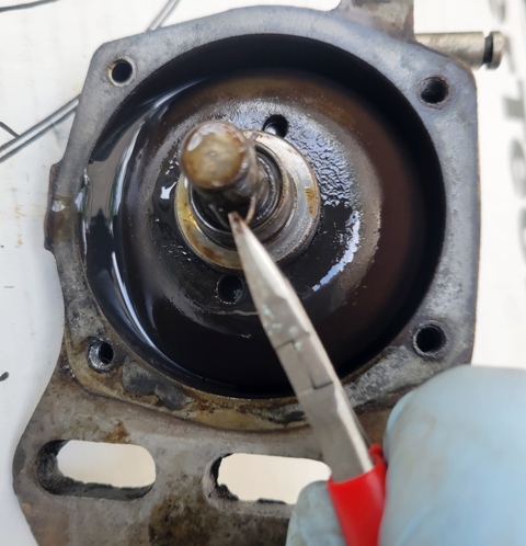 Seventh - The linkage side of the governor halves required a little more effort. First remove the upper access/fill port screw. This will expose a drift pin (you need to slightly rotate the linkage shaft to see the pin (note the pin in the second picture)). I put a second punch between the housing and linkage to hold the shaft in the appropriate position to allow me to drive the pin from the outside toward the inside. You can then slide the shaft out and set it, the pin and the the fork aside in a safe place. Because of the caged bearing being installed removing the seal presented a challenge. As you can see in the fourth picture a screwdriver being used to pry did not work. I ended up drilling several small holes near the outer edge of the seal close to the housing and was then able to twist the seal out with the small needle nose pliers seen in a couple other picture. I was then able to tap in the new seal = CR 3687.