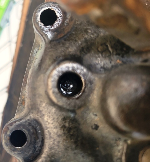 Fifth - I removed the four 9/16" wrench size bolts and set them aside in a safe place, then held the housing over a drain pan to catch any remaining oil as I split the housing halves.